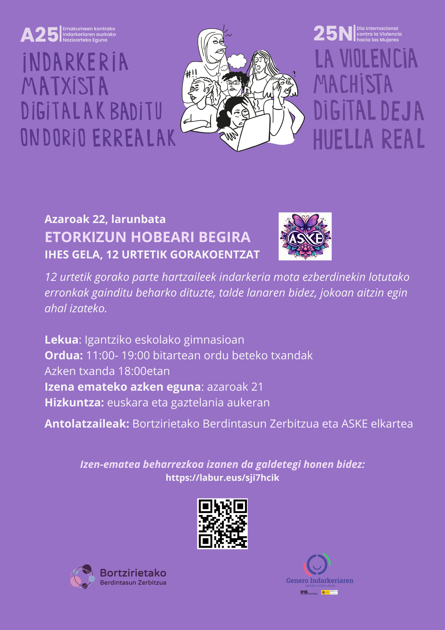 El objetivo principal es incorporar la transversalidad de género en todos los ámbitos en los que los ayuntamientos de Bortziriak tienen competencia, con el fin de impulsar la igualdad entre mujeres y hombres.