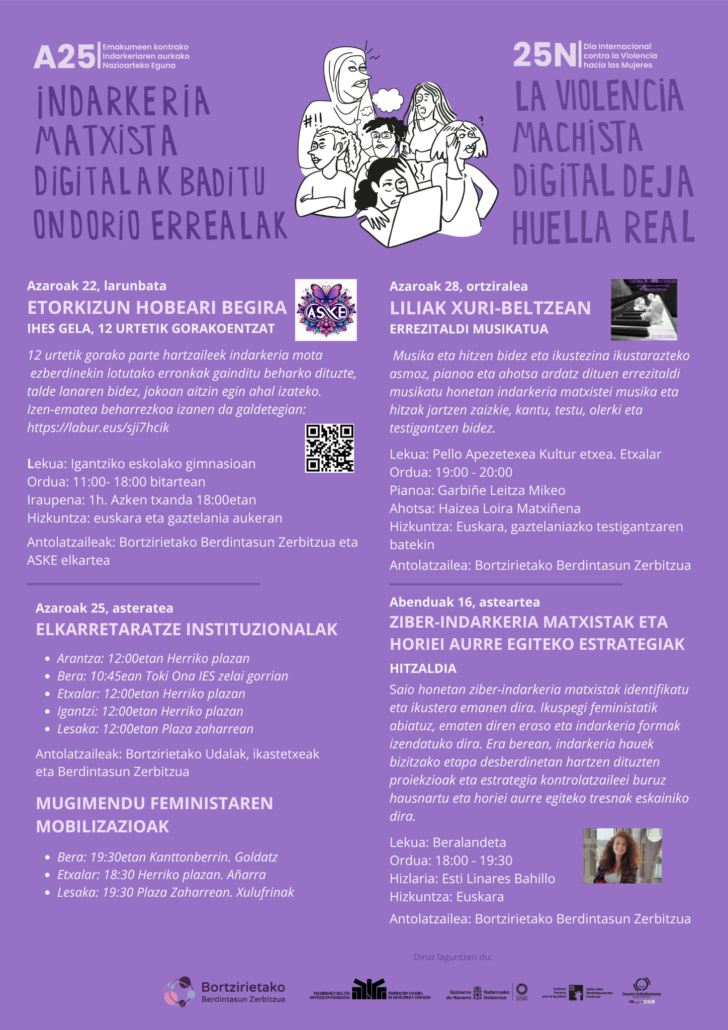 Azaroak 25 honetan, gizarte osoa gonbidatzen dugu rol aktiboa har dezan ingurune digital, benetan aske, berdintasunezko eta segurua eraikitzeko. Konpromiso kolektiboaren bidez bakarrik lortu ahal izango dugu emakumeen aurkako indarkeriarik gabeko gizartea.